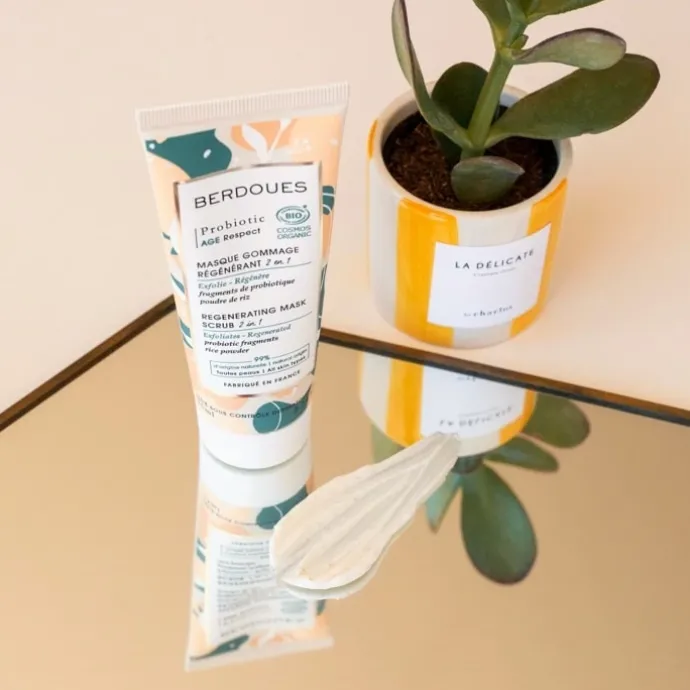 Action 2 en 1 | Le Masque Gommage Régénérant stimule le renouvellement cellulaire, active la microcirculation et libère la peau de ses impuretés tout en la préservant.