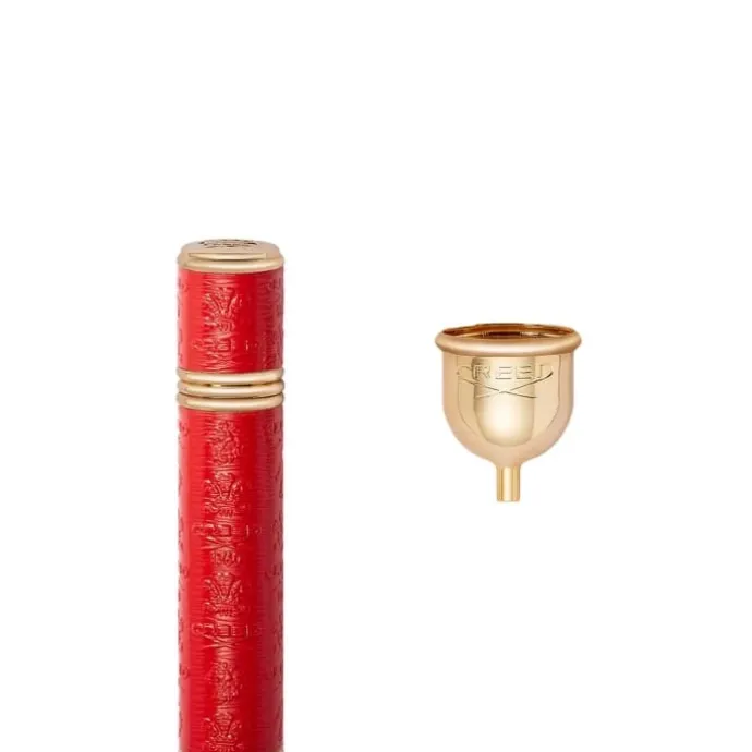 Séduisant par son élégance traditionnelle, ce vaporisateur cylindrique Creed de 10 ml magnifié de finitions dorées est protégé par un étui au cuir rouge embossé.