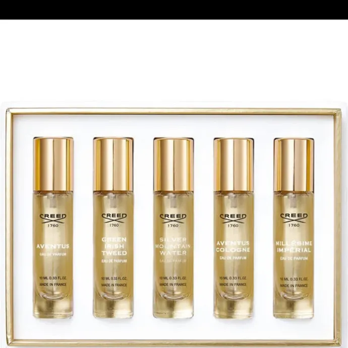 Présenté dans un coffret Creed iconique avec le motif caractéristique de la marque, l’ensemble-cadeau de cinq eaux de parfum de 10 ml pour homme décline les parfums emblématiques de la maison : Aventus, Aventus Cologne, Green Irish Tweed, Silver Mountain Water et Millésime Impérial.