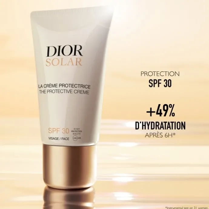 Bénéfice produit : Dior Solar La Crème Protectrice Visage SPF 30 protège la peau des UVA/UVB tout en la rendant visiblement plus belle : la peau est éclatante et hydratée, le bronzage est uniforme.