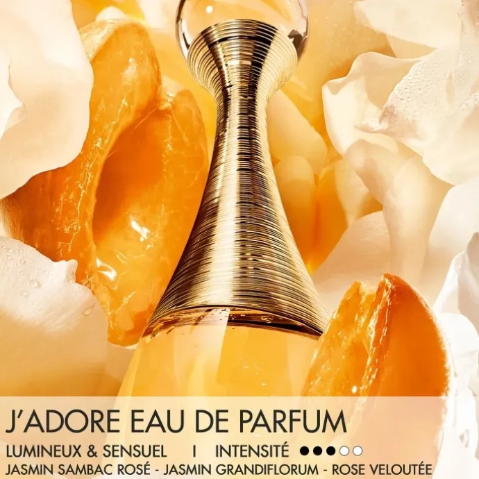 J’adore, le parfum pour femme de légende de la maison Dior, s’épanouit dans un arrangement floral de notes d’ylang-ylang, de rose damascena et de jasmins grandiflorum et sambac.