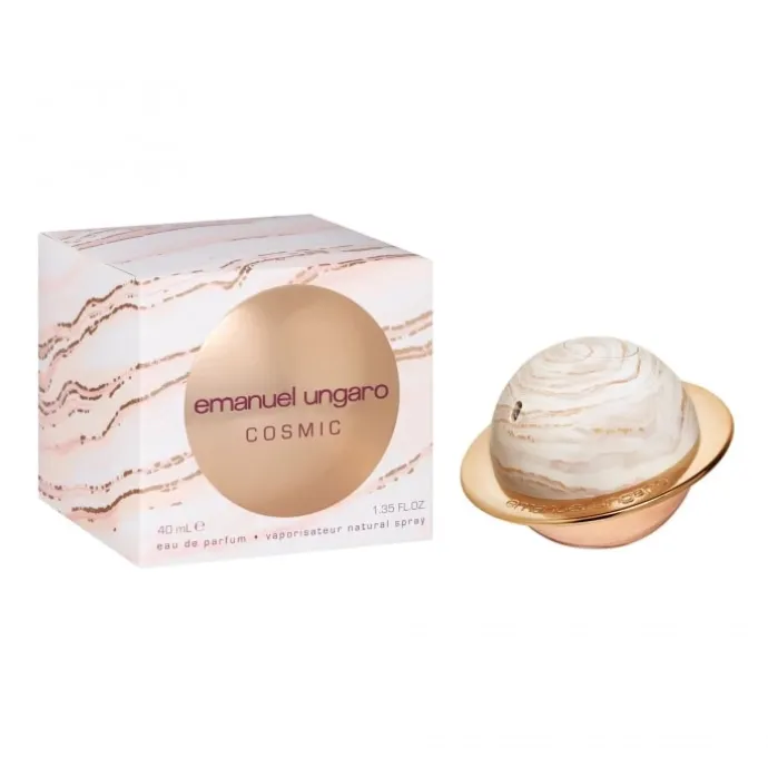 Inspiré par la mode futuriste « Space Age » d’Emanuel Ungaro des années 60, EMANUEL UNGARO COSMIC présente un flacon en forme de planète avec un capuchon élégamment intégré.