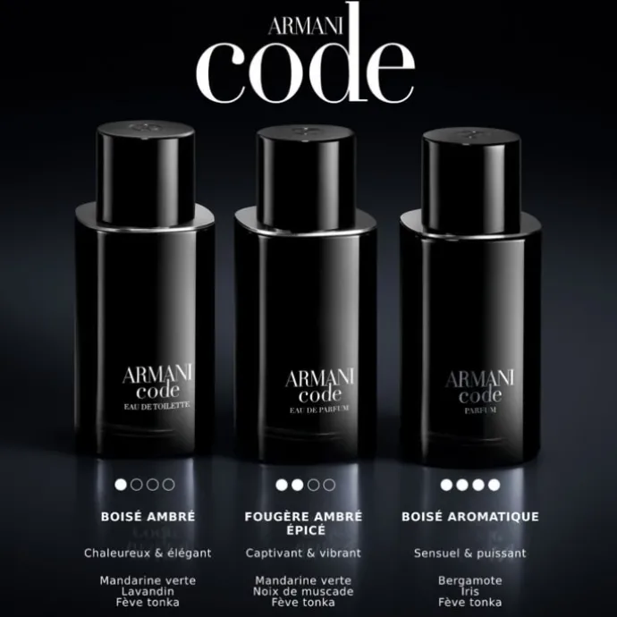 Le flacon de l’eau de parfum Armani Code exprime une vision moderne du luxe.