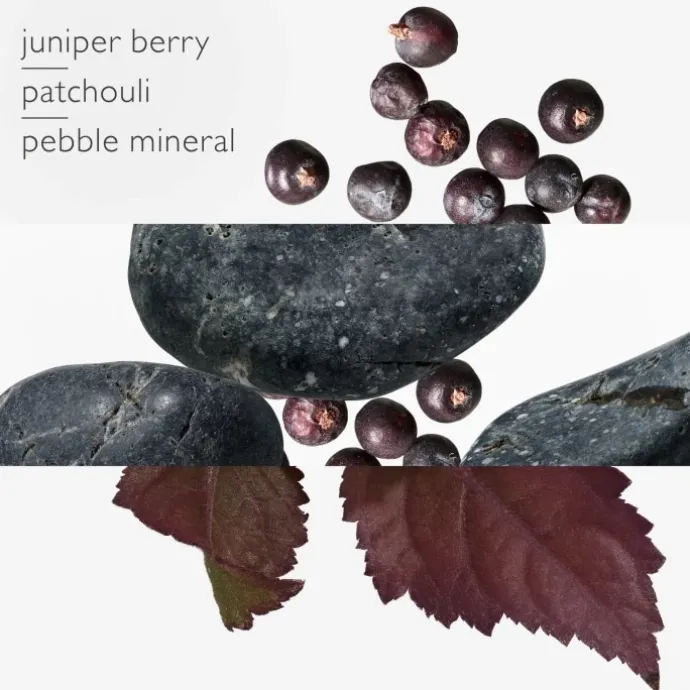 Une Eau de Toilette boisée et minérale, qui mêle une baie de genièvre éclatante, un patchouli chaleureux et un galet salé.