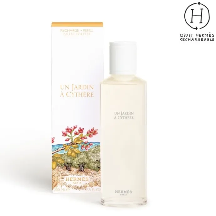 La recharge d’eau de toilette Un Jardin à Cythère permet de recharger les flacons 100 ml, 50 ml et 30 ml. Un geste indissociable d’un objet créé pour durer.