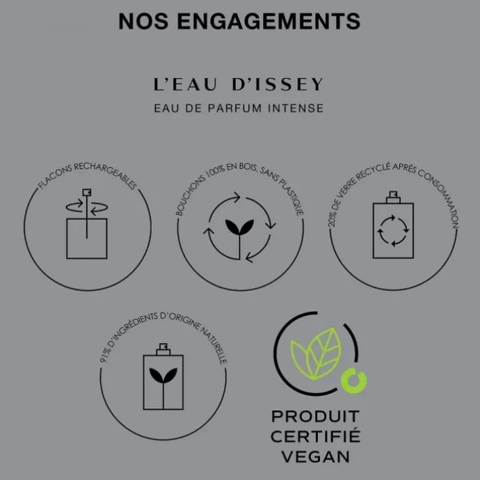 L’Eau d’Issey eau de parfum intense est végan et composée à 91 % d’ingrédients d’origine naturelle.