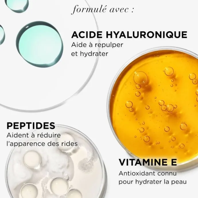 - À base de sérum de soin solide à 95 % comprenant de l’acide hyaluronique, de la céramide, de la vitamine E et des peptides dans une formule hydratante et lissante