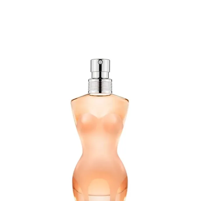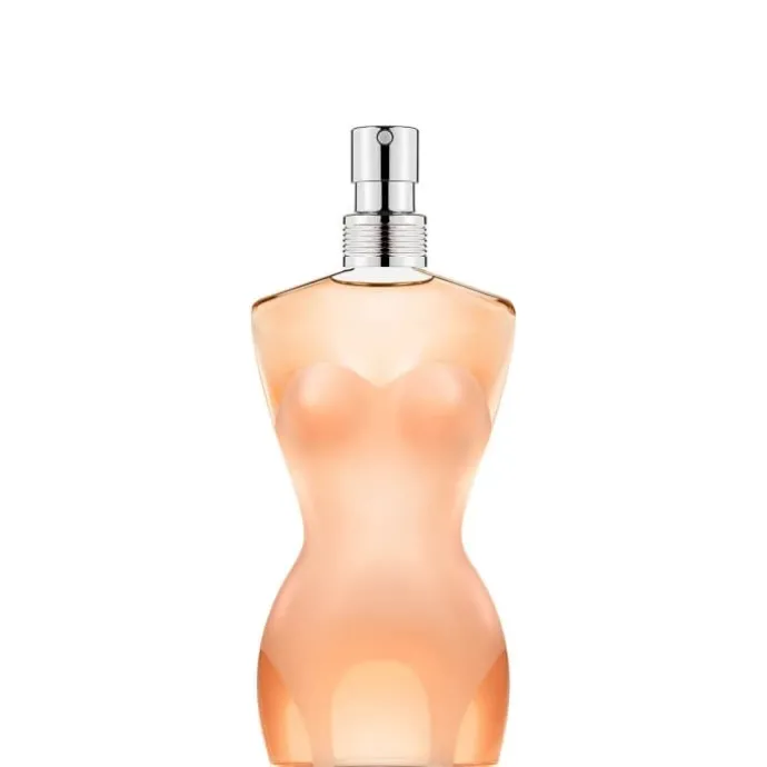 L’eau de toilette Classique Jean Paul Gaultier est proposée dans un flacon en forme de buste aux lignes ultra sensuelles. Revêtue d’un corset emblématique de la maison Jean Paul Gaultier, la silhouette affiche une taille, des hanches et une poitrine marquée pour révéler sa féminité. Le jus en lui-même révèle une couleur pêche qui évoque toute la sensualité et la tendresse de la peau d’une femme.