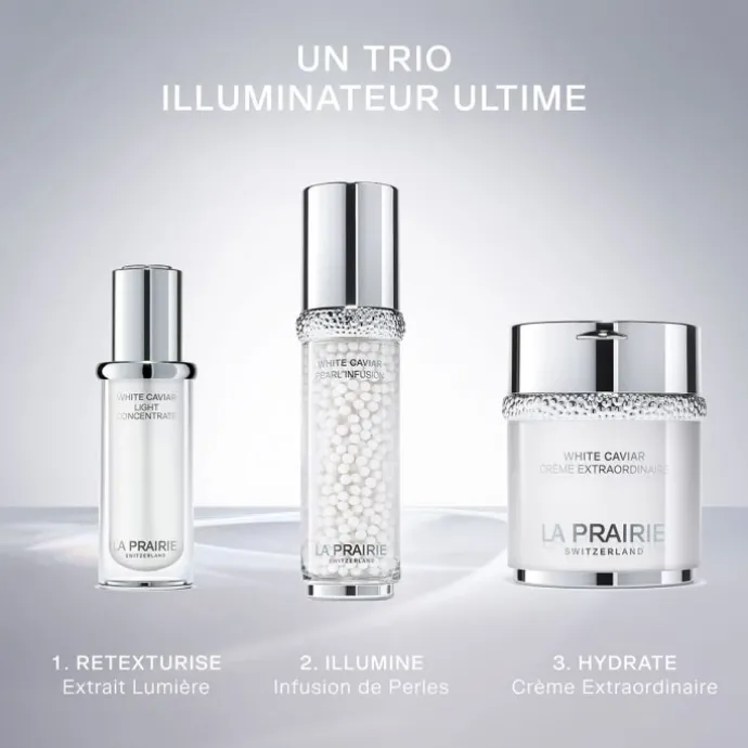 • Avec la collection White Caviar, enrichie de puissants ingrédients actifs dont la Lumidose, La Prairie s’inspire de la sereine clarté des lacs suisses pour élever les soins du visage au rang d’art