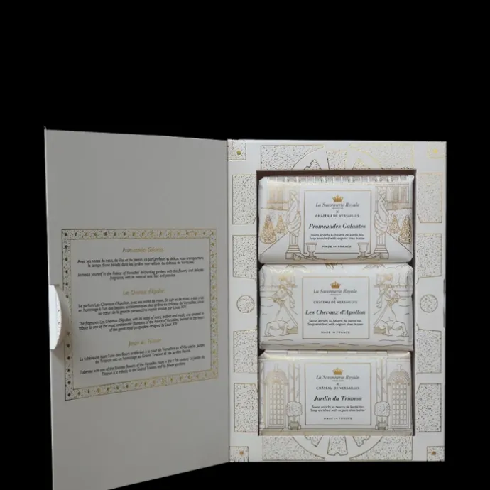 Découvrez l’univers olfactif d’une balade dans les jardins du château de Versailles, avec le Coffret 3 savons réalisé en partenariat avec le château de Versailles.