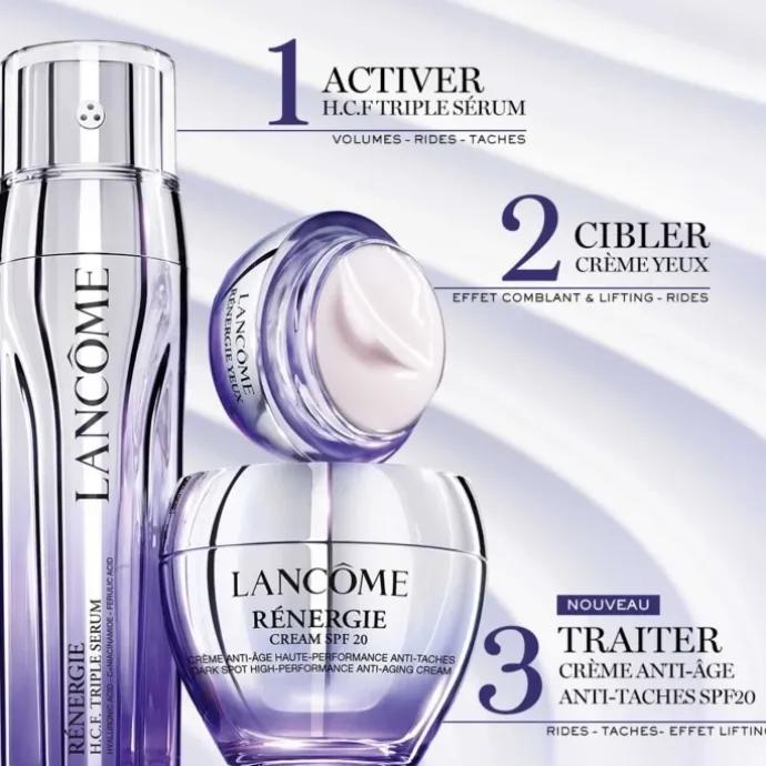 - – Etape 1 : Activez avec Rénergie H.C.F. Triple Sérum pour rénover la peau à tous les niveaux : volumes, rides, taches.
