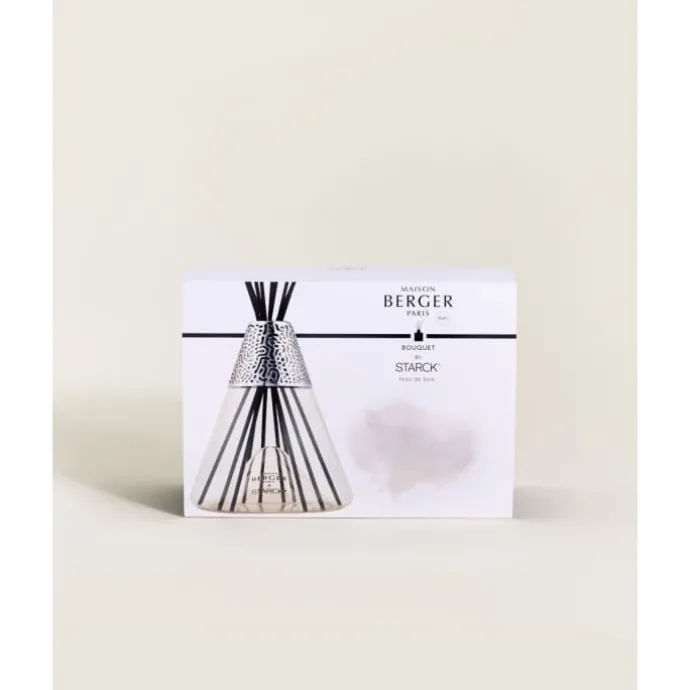 Le Bouquet parfumé Starck Peau de Soie est empreint de féminité et de modernité. Les lignes pures et intemporelles, en filigrane de la collection, sont le résultat d’une vision commune, celle du designer Philippe Starck et de Maison Berger Paris. L’œil est tout de suite interpellé par la forme conique singulière de l’objet rappelant la verrerie de laboratoire. Toute son originalité réside dans le façonnage de sa semelle. Celle-ci a été bombée, donnant comme une impression de « verre dans le verre » et une sensation de légèreté. Tandis que sa bague métallique aux motifs organiques signe l’ensemble. Le Bouquet parfumé Starck Peau de Soie s’inscrit dans une tendance minimaliste. Revêtu d’une couleur rose translucide pleine de délicatesse, incarnant à merveille le parfum Peau de Soie 400 ml qui l’accompagne, partez pour un ballet olfactif fascinant. Profitez des notes poudrées de violette subtilement contrastées par le musc blanc et les senteurs chyprées du patchouli, dans une belle dualité féminin/masculin.