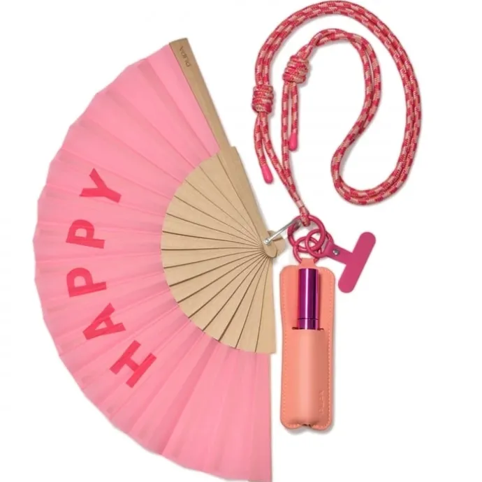 Accessoire portable composé d’une bandoulière réglable, de mousquetons amovibles, d’un porte-mascara, d’un éventail et d’une languette pour téléphone portable universelle.