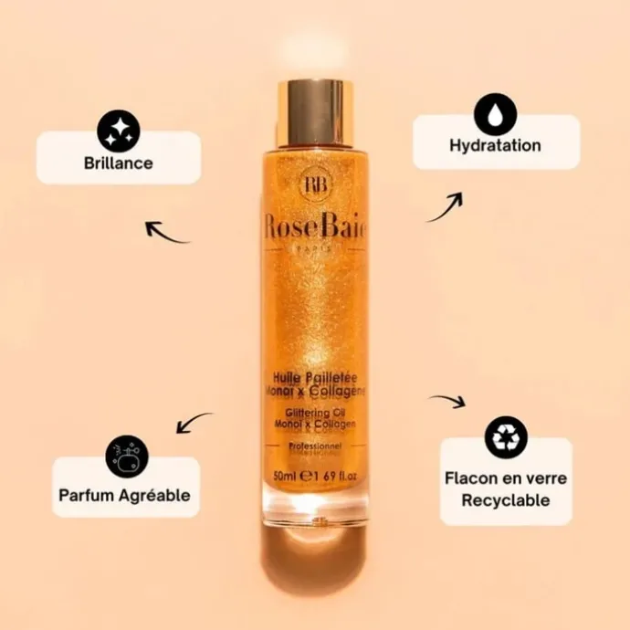 L’huile pailletée au Monoï et au collagène offre une hydratation profonde et est apaisante pour la peau et les cheveux.