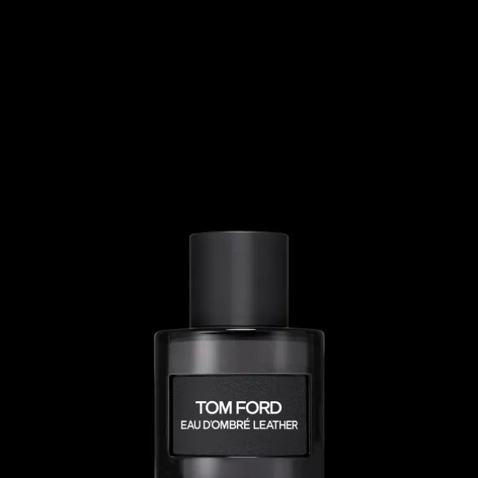 L’Eau d’Ombré Leather est présentée dans un flacon noir translucide avec une plaque en faux cuir.