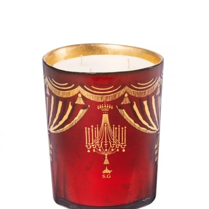 Les quatre bougies parfumées se font relaient d’un art de vivre royal. Elles se couvrent de feuilles d’or 24 carats à l’intérieur et s’animent, sur l’extérieur, de lustres, pampilles et rideaux stylisés.