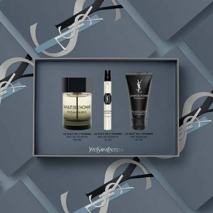 Le flacon iconique La Nuit de L’Homme Yves Saint Laurent est habillé d’un luxueux dégradé de noir et révèle un jus mystérieux.