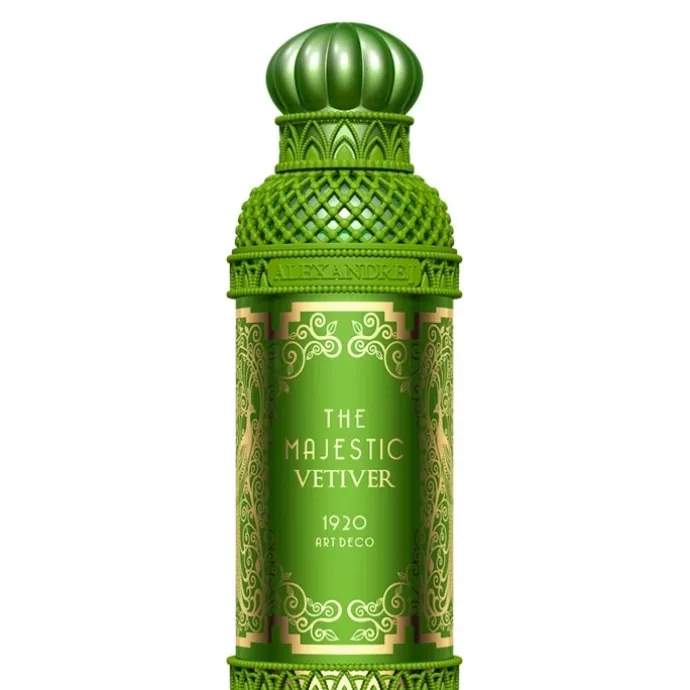 Comme toutes les fragrances de la collection Art Deco, l’eau de parfum The Majestic Vétiver Alexandre J se présente dans un écrin de style méditerranéen aux couleurs vives. Entièrement recouvert d’un laquage vert, ce flacon affiche un aspect à la fois luxueux et authentique. Le nom de l’essence, qui apparaît en lettres dorées, est entouré d’arabesques au style résolument oriental.
