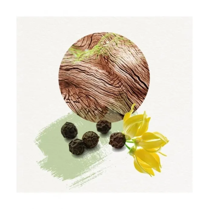Notes de cœur : Puis les notes charnelles de cardamome zestées, et du patchouli, s’unissent aux nuances boisées, pleine de noblesse, de bois blanc et de cèdre.