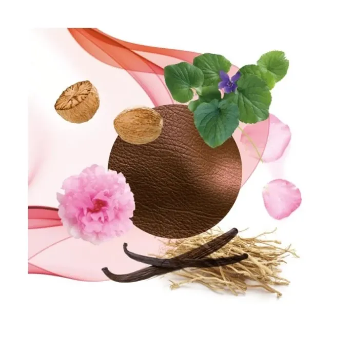Notes de cœur : un cœur doux et délicat aux accents de rose, qui se fait rond et puissant grâce aux notes de cuir, et enfin voluptueux avec l’opoponax.
