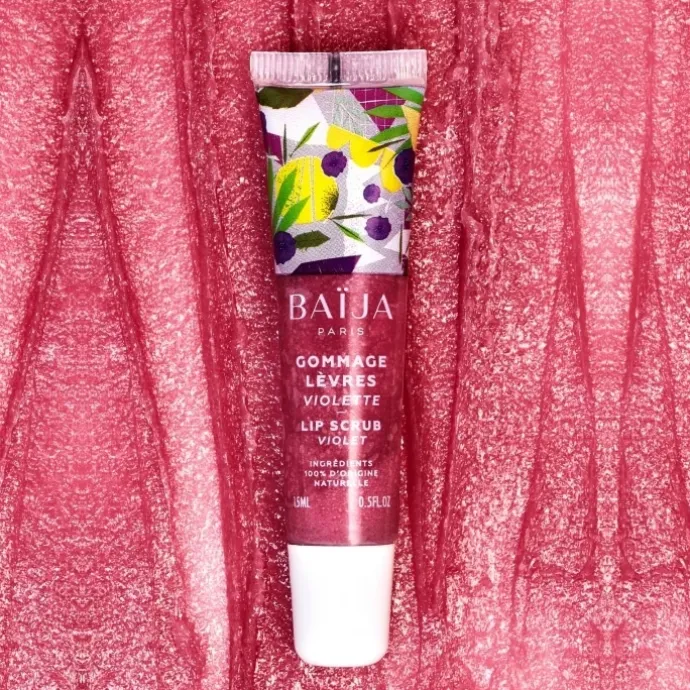 Gommage lèvres violette – Sans paraben – sans alcool – parfum gourmand fruité – texture compacte et souple, fins grains de sucre