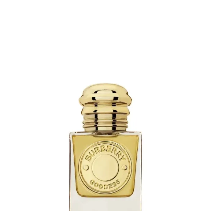 Inspirée des couleurs du soleil couchant, l’eau de parfum Burberry Goddess Intense, au parfum légèrement ambré, est présentée dans un flacon luxueux orné d’un médaillon doré.