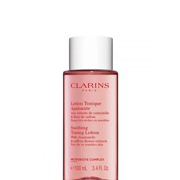 La Lotion Tonique Clarins, qui parfait le démaquillage, hydrate, apaise et adoucit la peau grâce à un cocktail de plantes.