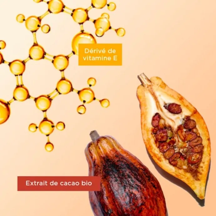 - Extrait de cacao bio : double action anti-âge et hydratante renforcée. Il aide à booster la synthèse de collagène et la synthèse d’acide hyaluronique pour une peau intensément hydratée.