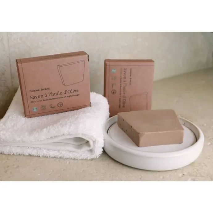 Le savon à l’huile d’olive enrichi en huile de bourrache & argile rouge COMME AVANT offre une solution de nettoyage visage & corps répondant aux préoccupations des peaux matures.