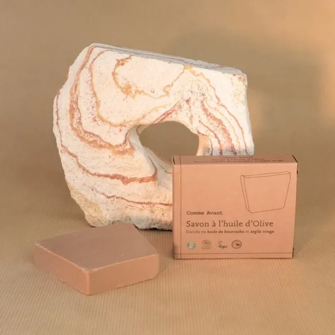 Selon le procédé de la saponification à froid, le savon Comme Avant profite d’un enrichissement en huile de bourrache et argile rouge.