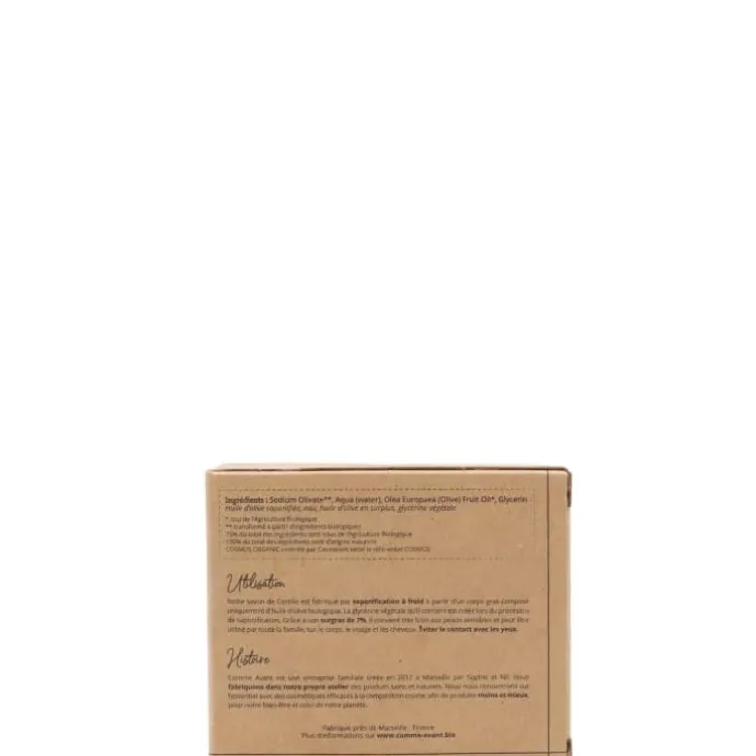 Fabriqué à la main dans l’atelier de Comme Avant près de Marseille, il ne contient que de l’huile d’olive biologique dans son corps gras et possède un surgras de 7%.