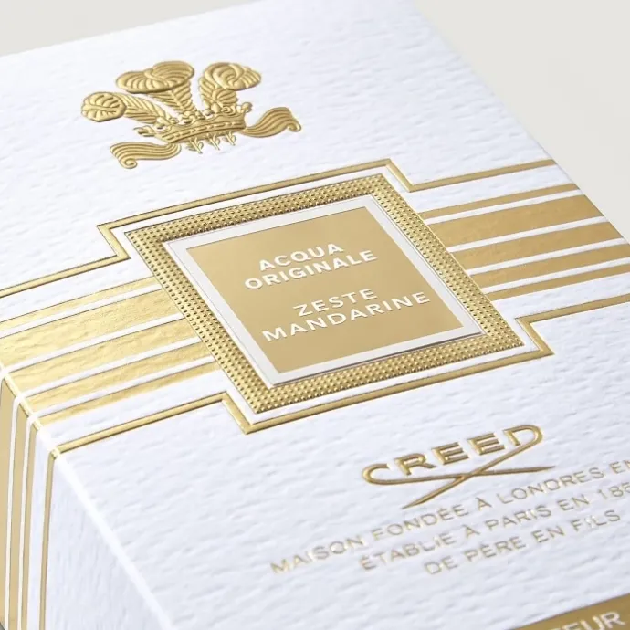 Les parfums de la collection Acqua Originale se présentent dans un luxueux flacon en verre à l’esprit art déco. Avec ses parois délicatement façonnées, ce précieux écrin témoigne de la longue tradition artisanale de la maison Creed. Chacune des fragrances de la collection affiche un coloris différent, c’est donc tout naturellement que l’eau de parfum Zeste Mandarine Creed se pare d’une jolie teinte orangée. Coiffé d’un bouchon doré dont les multiples facettes jouent avec la luminosité, le flacon de ce parfum mixte Creed semble contenir tout l’éclat et toute l’intensité des paysages ensoleillés de la Sicile.