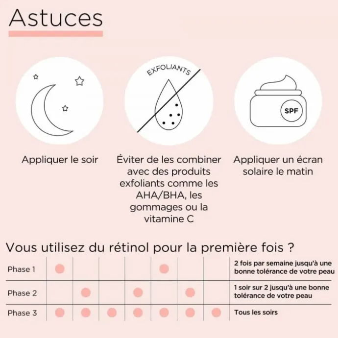 - Convient à tous les types de peau. Formule conçue pour éviter le désechèment de la peau qui peut être souvent associée au rétinol.