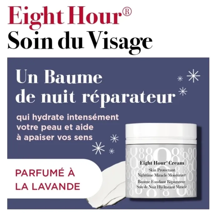 Inspirée par la mythique formule et les bénéfices du Baume Apaisant Réparateur Eight® Hour Cream, ce soin de nuit réparateur miracle hydrate intensément votre peau, pendant que la relaxante Lavande aide à apaiser vos sens.
