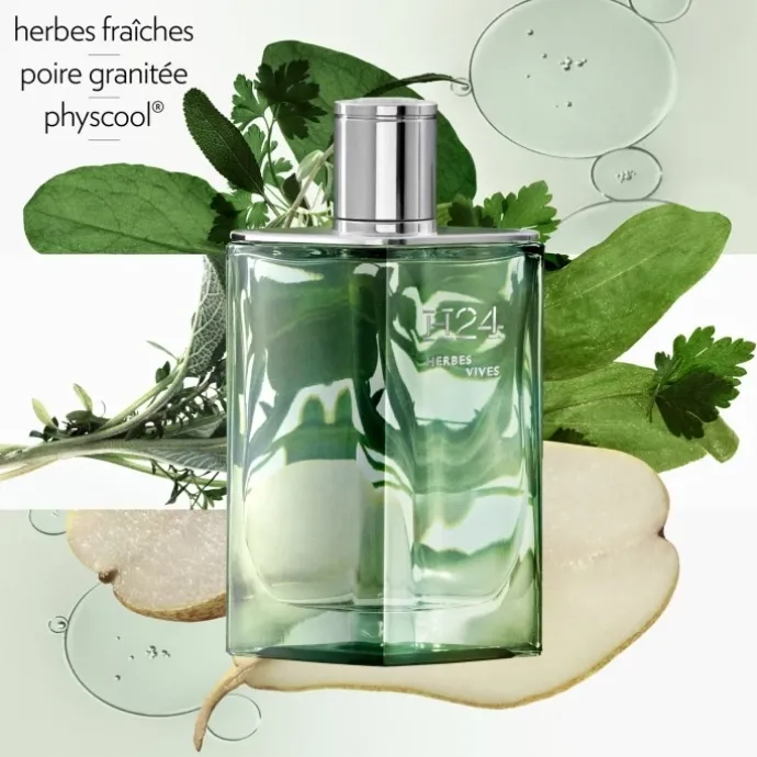 L’eau de parfum H24 Herbes Vives associe la puissance d’un bouquet d’herbes fraîches, la texture d’une poire granitée et la vivacité d’une molécule high-tech, le Physcool®.