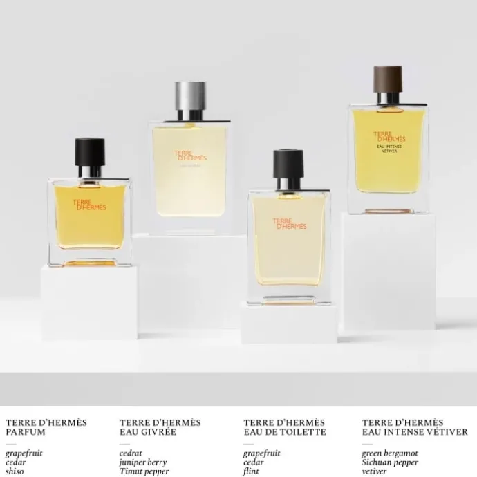 L’Eau de Parfum Terre d’Hermès Eau Givrée allie un cédrat vif, une baie de genièvre à la fraîcheur incisive et un poivre Timut fusant. La sensation saisissante d’un souffle glacé y côtoie la générosité des notes minérales et boisées typiques de Terre d’Hermès.