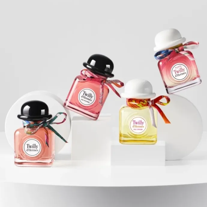 Le nom de la tribu parfumée Twilly d’Hermès évoque le métier de la soie Hermès : le twilly, petit ruban joyeux et coloré aux multiples portés, est le détournement du carré en twill de soie de la maison.