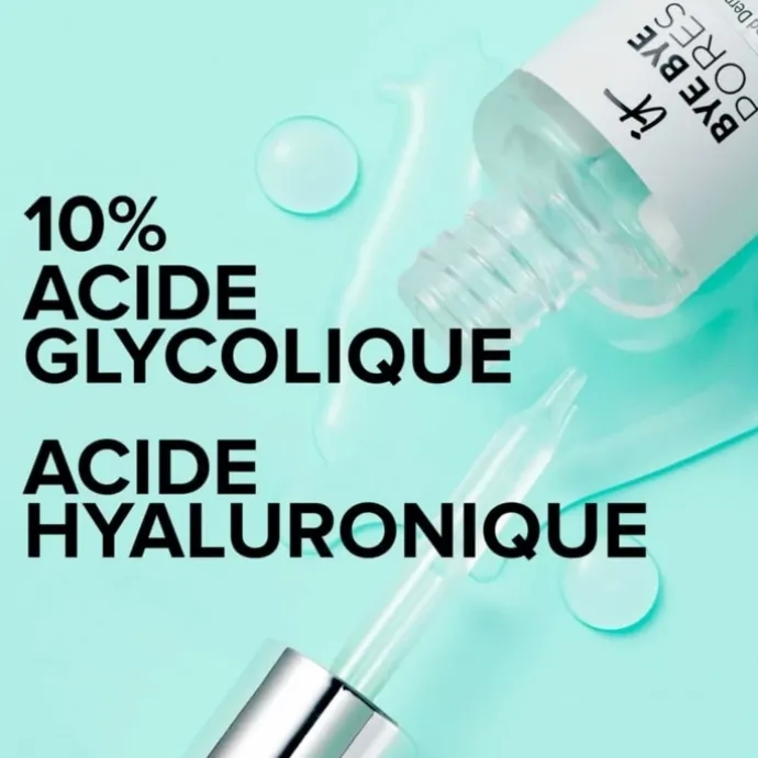 Formulé avec 10 % d’acide glycolique, le sérum Bye Bye Pores exfolie et affine le grain de peau !