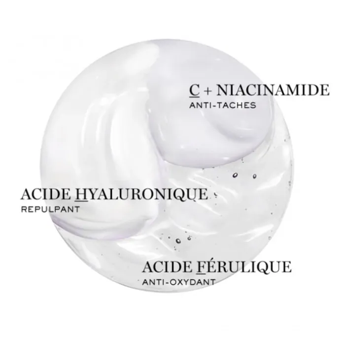 – Vitamine C + Niacinamide : unifie le teint, lutte contre les taches et apaise la peau.