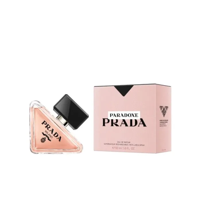 Encapsulant l’essence même de Prada, le flacon rechargeable Paradoxe réinvente le code iconique de la marque : son logo triangle. Décalée, mais puissamment ancrée, la silhouette radicale de la bouteille est adoucie par des angles arrondis, tandis que la délicate couleur rose corail du parfum contraste avec le noir profond du capot et du blason Prada.