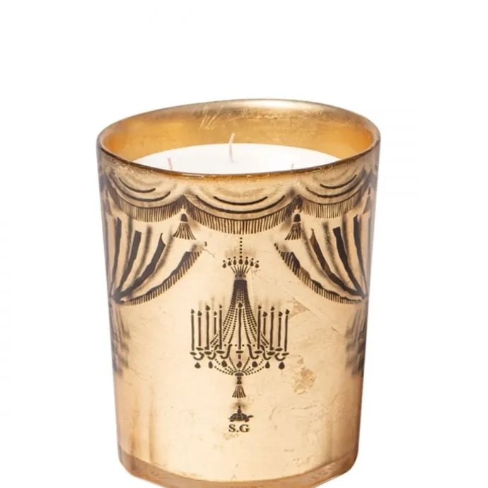 Les quatre bougies parfumées se font relaient d’un art de vivre royal. Elles se couvrent de feuilles d’or 24 carats à l’intérieur et s’animent, sur l’extérieur, de lustres, pampilles et rideaux stylisés.