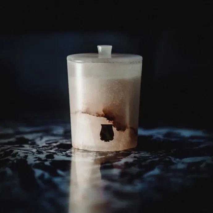 Délicat, l’albâtre vient remplacer le verre traditionnel et coiffer la bougie parfumée d’un capot ton sur ton.