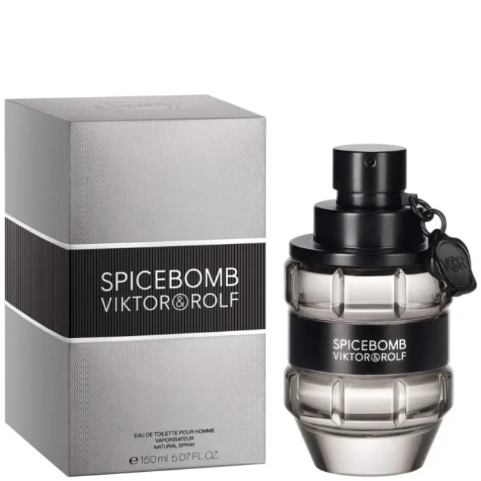 Retrouvez Spicebomb Viktor&Rolf dans un flacon facetté en forme de grenade grise argentée. Un bandeau central noir brillant vient élégamment ceinturer la bouteille, alors que le sceau de Viktor&Rolf, accroché au spray, fait office de détonateur sur cette arme de séduction massive.